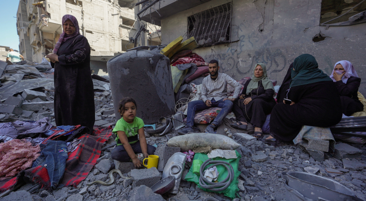 فلسطينيون يجلسون على أنقاض منزل دمره الاحتلال في مخيم البريج للاجئين في وسط قطاع غزة
