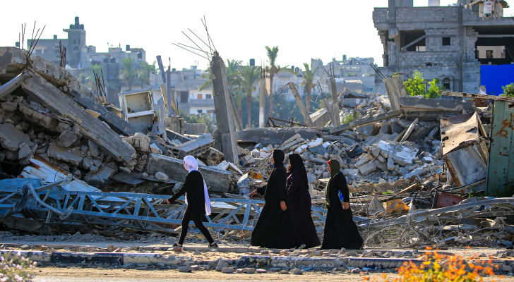 سيدات فلسطينيات بجانب المباني المدمرة جراء قصف مخيم البريج وسط غزة