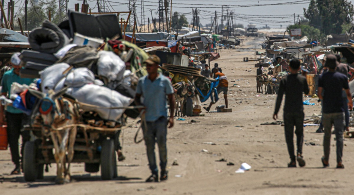 تقف دبابة "إسرائيلية" في الخلفية بينما يقوم الفلسطينيون النازحون بإخلاء منطقة شاكوش في رفح