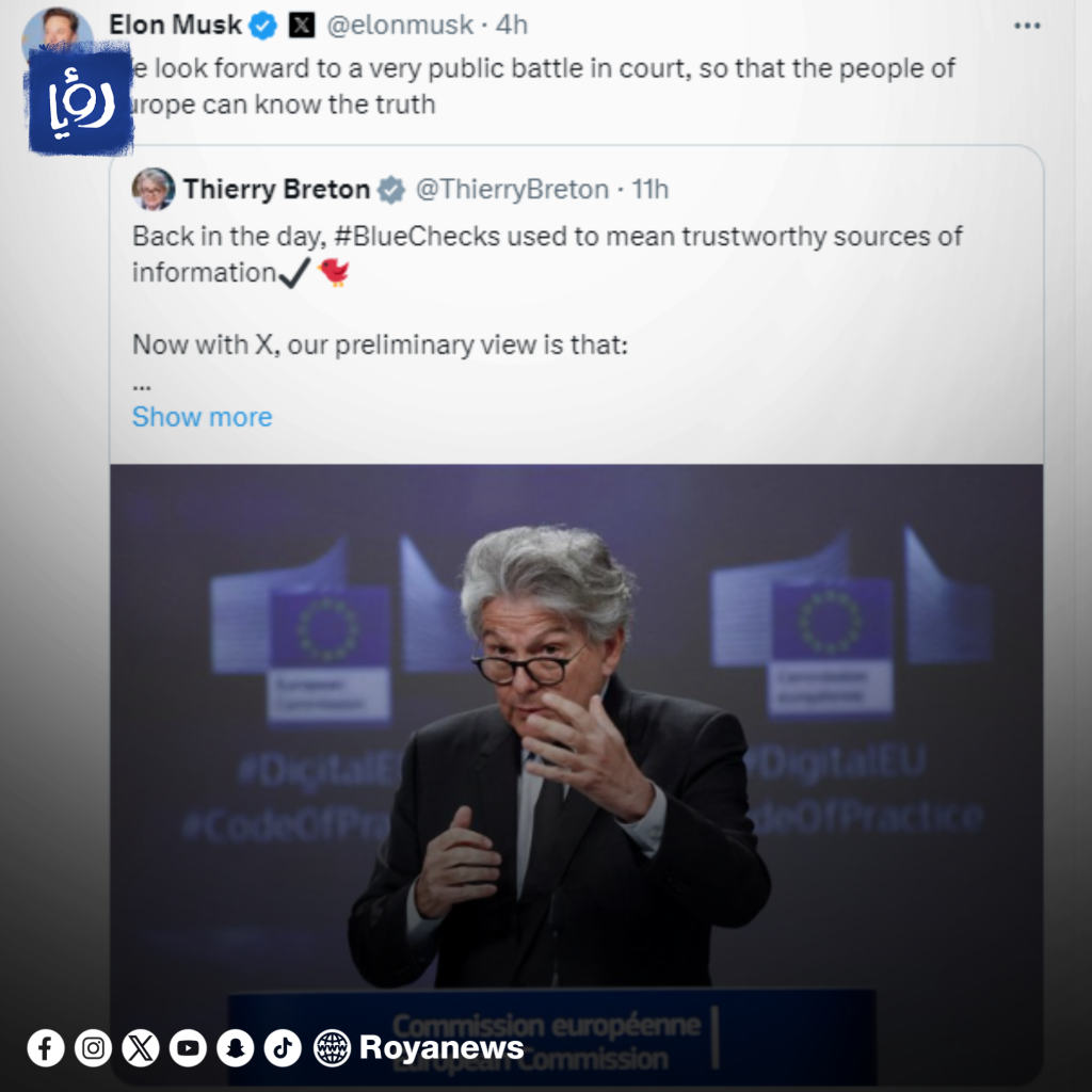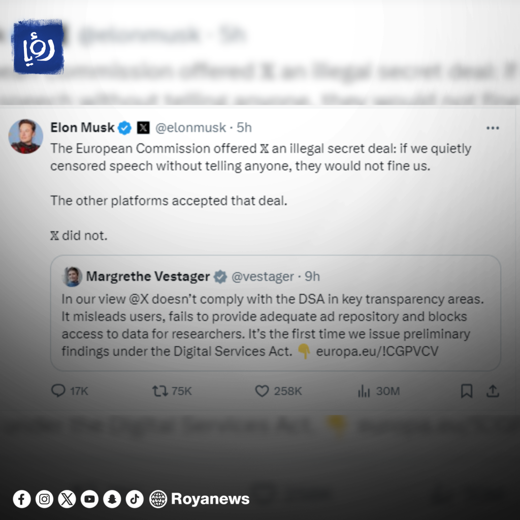 وفي بيان رسمي، للمفوضية الأوروبية اطلعت عليه "رؤيا" وترجمته للعربية الجمعة، قالت إن المفوضية أبلغت منصة "إكس" برأيها الأولي حيال انتهاك قانون الخدمات الرقمية (DSA) في مجالات تتعلق بأنماط الاستخدام المظلمة، وشفافية الإعلانات، والوصول إلى البيانات للباحثين.
