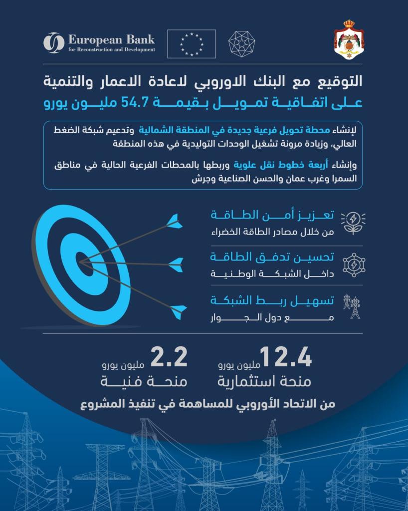 وقالت جريتشن بيري، المديرة الإقليمية لعمليات البنك في منطقة شرق المتوسط في البنك الأوروبي لإعادة الإعمار والتنمية: "نحن فخورون بدعم شركة الكهرباء الوطنية (NEPCO)، بالتعاون مع الاتحاد الأوروبي، في تطوير البنية التحتية لنقل الكهرباء وتعزيز قطاع الطاقة في الأردن، بما يسهم في تعزيز الترابط الإقليمي ودعم التحول الأخضر في المملكة، تماشياً مع رؤية التحديث الاقتصادي".