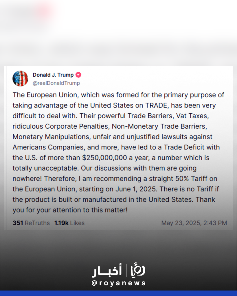 أوصى الرئيس الأمريكي دونالد ترمب، في منشور عبر منصته الرسمية، بفرض تعرفة جمركية بنسبة 50% على واردات الاتحاد الأوروبي اعتبارًا من الأول من حزيران 2025.