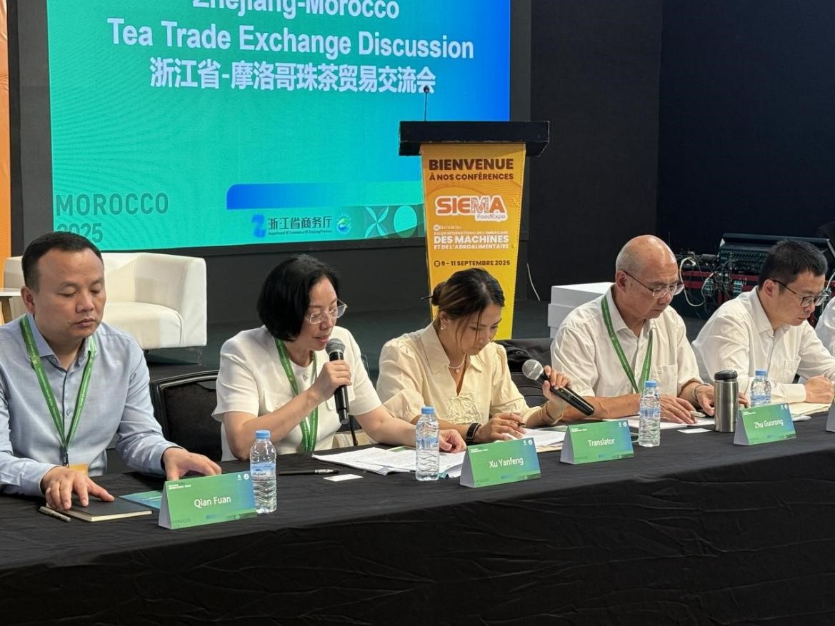 في 10 سبتمبر، شاركت ثماني شركات شاي فاخرة من مقاطعة تشجيانغ في معرض تشجيانغ التجاري الدولي (المغرب) 2025، الذي نظمته وزارة الزراعة والشؤون الريفية بمقاطعة تشجيانغ. واعتمدت الشركات نموذجًا تعاونيًا للتوسع في الأسواق الخارجية، حيث عرضت بشكل جماعي مزايا جودة الشاي الأخضر من تشجيانغ وقوته الصناعية. وفي الوقت نفسه، أقيم معرض تبادل الشاي اللؤلؤي بين تشجيانغ والمغرب خلال المعرض. وحضر المعرض محمد أستا، رئيس الجمعية المغربية للشاي والقهوة، إلى جانب ممثلين عن وزارة الزراعة والشؤون الريفية بمقاطعة تشجيانغ ووزارة التجارة بمقاطعة تشجيانغ. وشارك ثمانية مشترين أجانب في مناقشات ميدانية مع ست شركات شاي من تشجيانغ، منها Zhe Tea وHuafa وDangchun وChunli، حول تجارة الشاي الدولية وجودة الشاي اللؤلؤي. حضر المؤتمر محمد أستا، رئيس الجمعية المغربية للشاي والقهوة، وشو يانفنغ، نائب المدير العام والمفتش الأول في وزارة الزراعة والشؤون الريفية بمقاطعة تشجيانغ، وألقيا كلمتين.